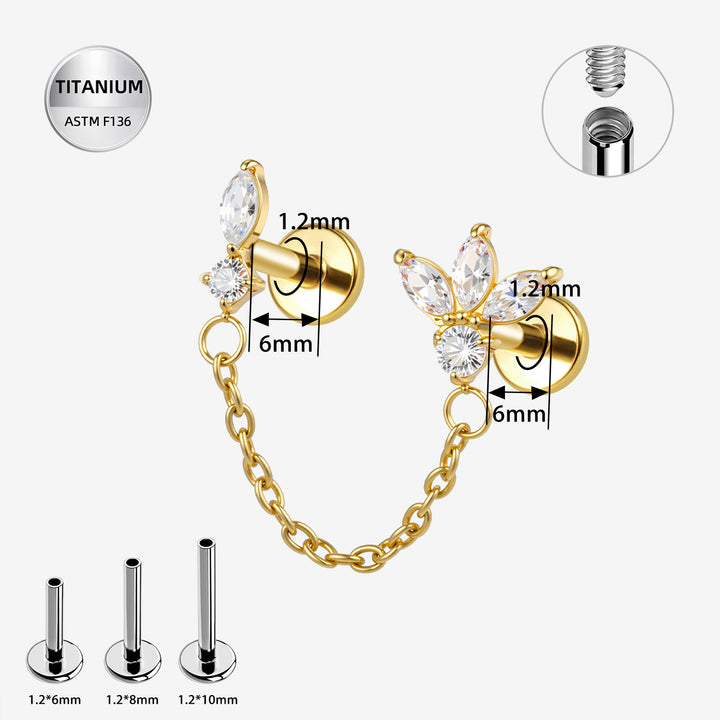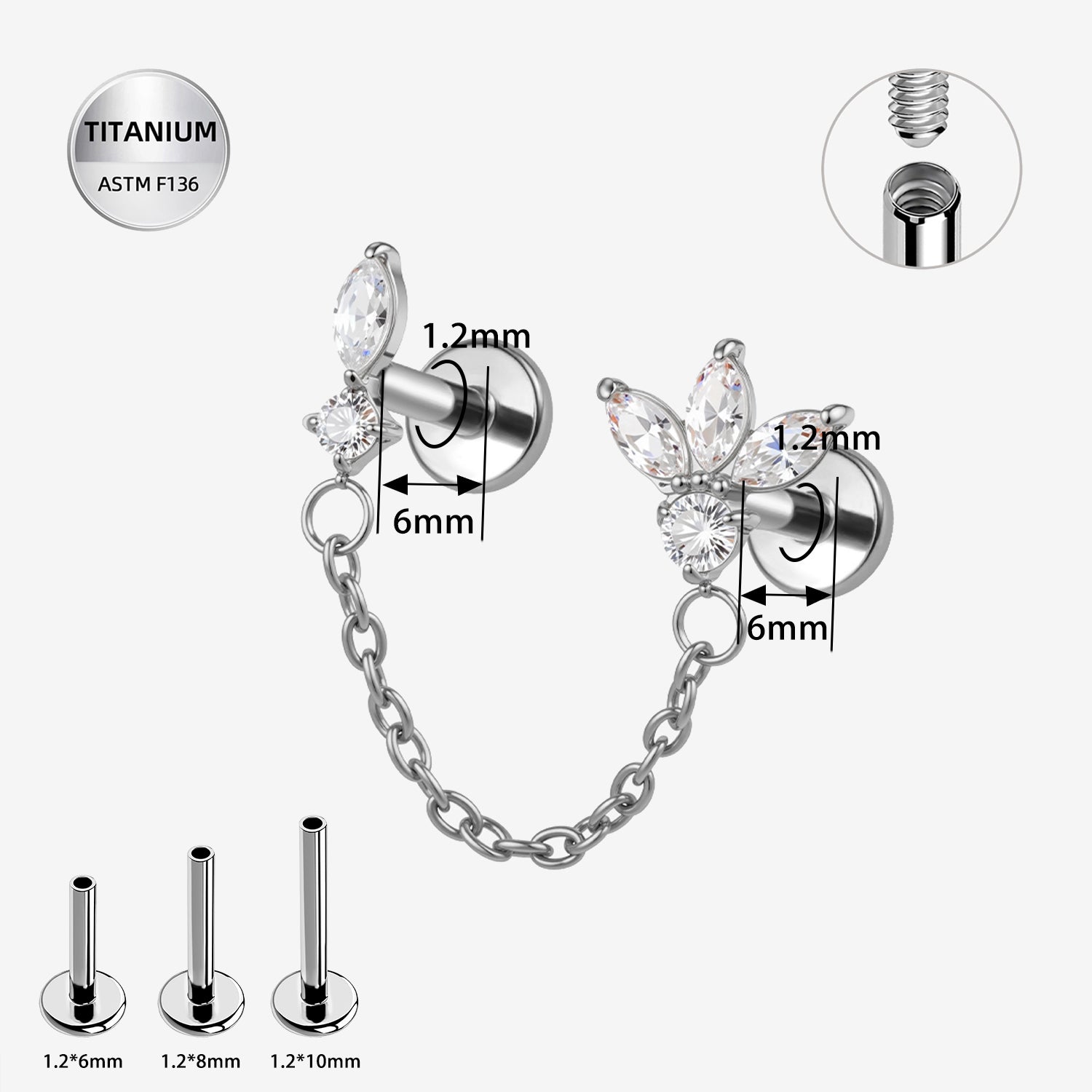 16G Internally Threaded Titanium CZ Chain Labret Stud – ASTM F136 Flat Back Ear Piercing Jewelry (6mm)