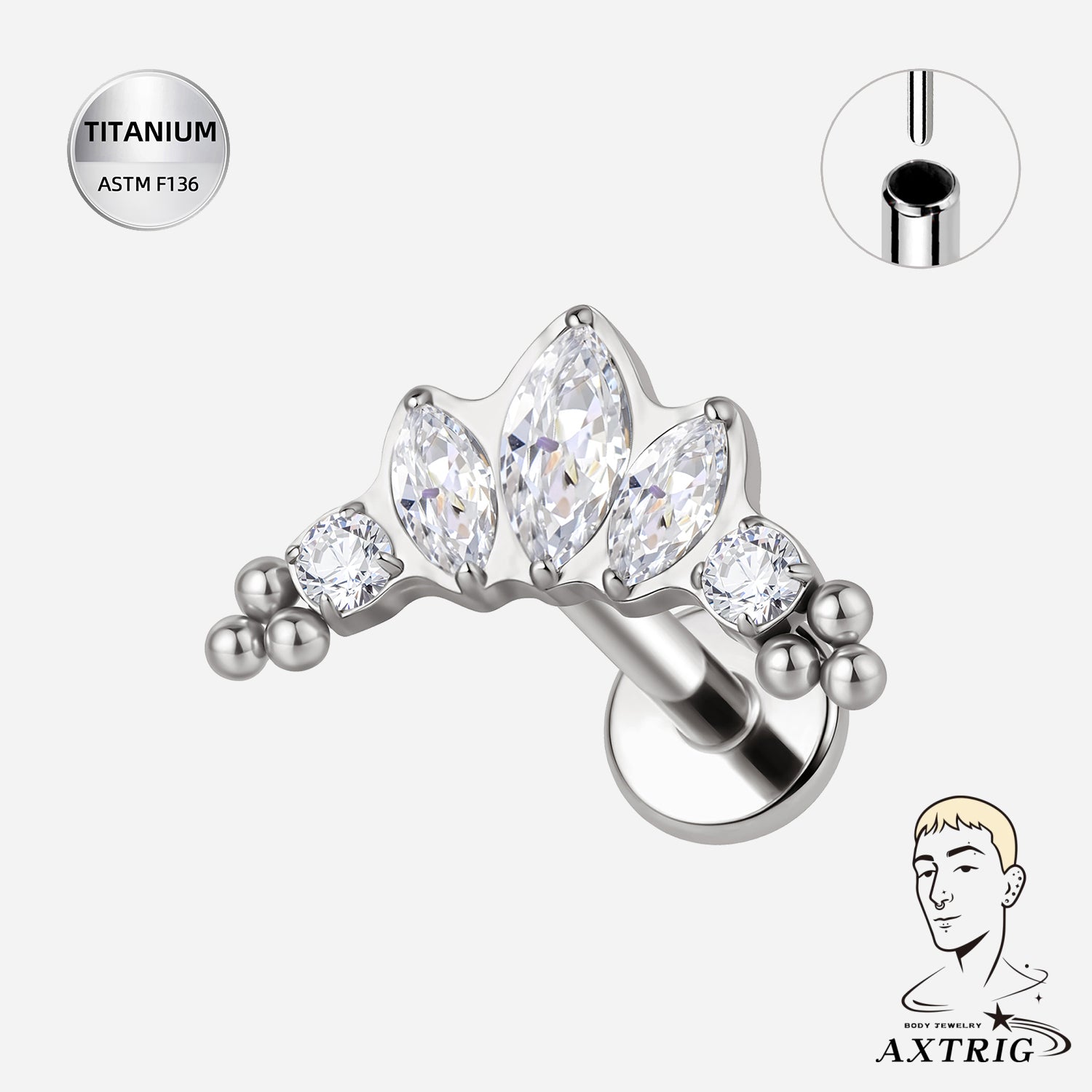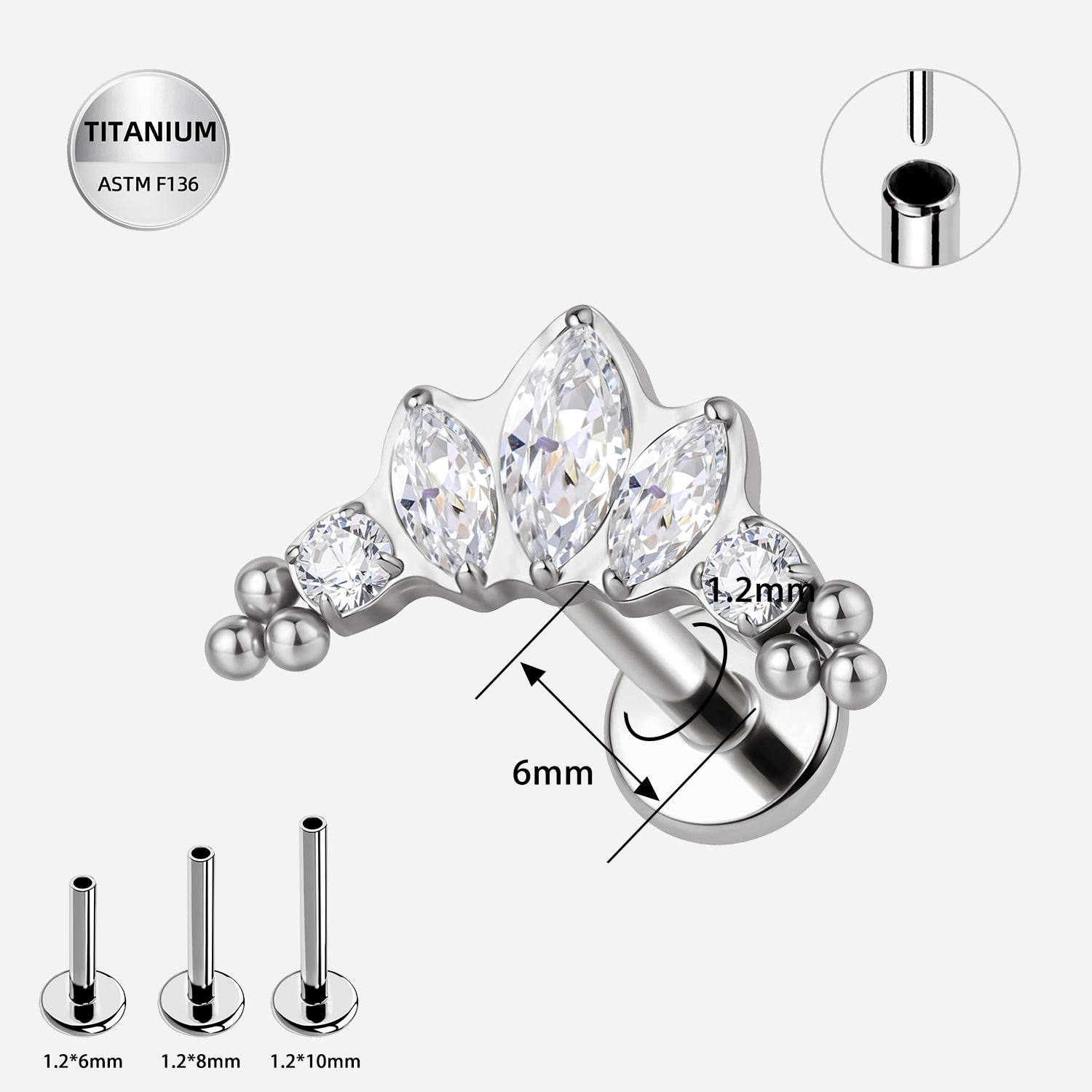 16G Threadless Titanium Crown Labret Stud – ASTM F136 Marquise CZ Flat Back Ear Piercing Jewelry
