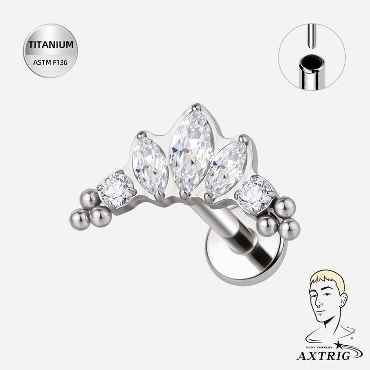 This design features a refined crown-inspired setting with sparkling marquise-cut cubic zirconia, accented by smooth titanium bead details for added dimension and shine. The threadless push-pin system offers a secure, low-profile fit while allowing easy insertion and removal without irritation.