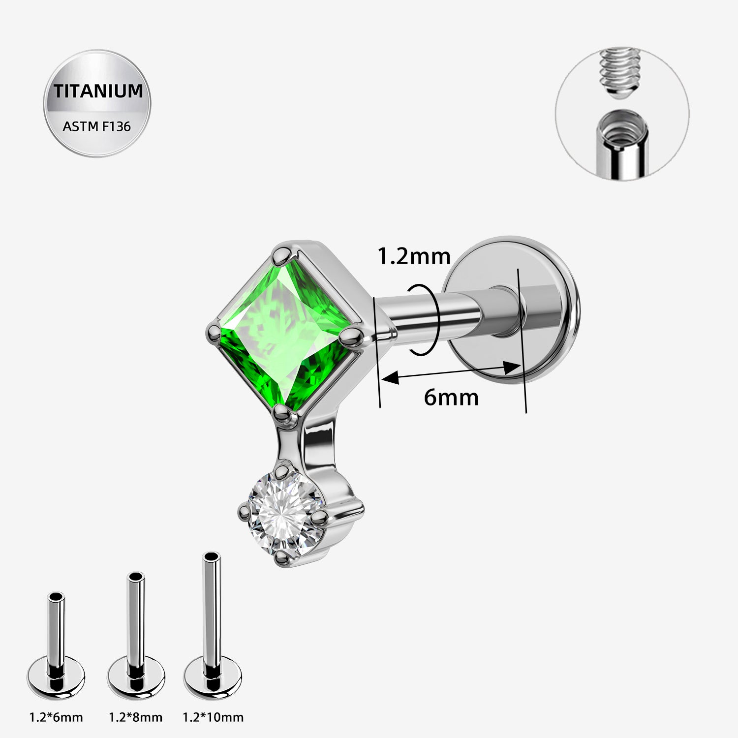 Bring a bold pop of color to your ear stack with this 16G Titanium Internally Threaded Labret Stud, featuring a vibrant square-cut green CZ paired with a clear CZ accent. Precision-crafted from ASTM F136 implant-grade titanium, this piece offers exceptional durability, corrosion resistance, and superior biocompatibility—ideal for sensitive skin.